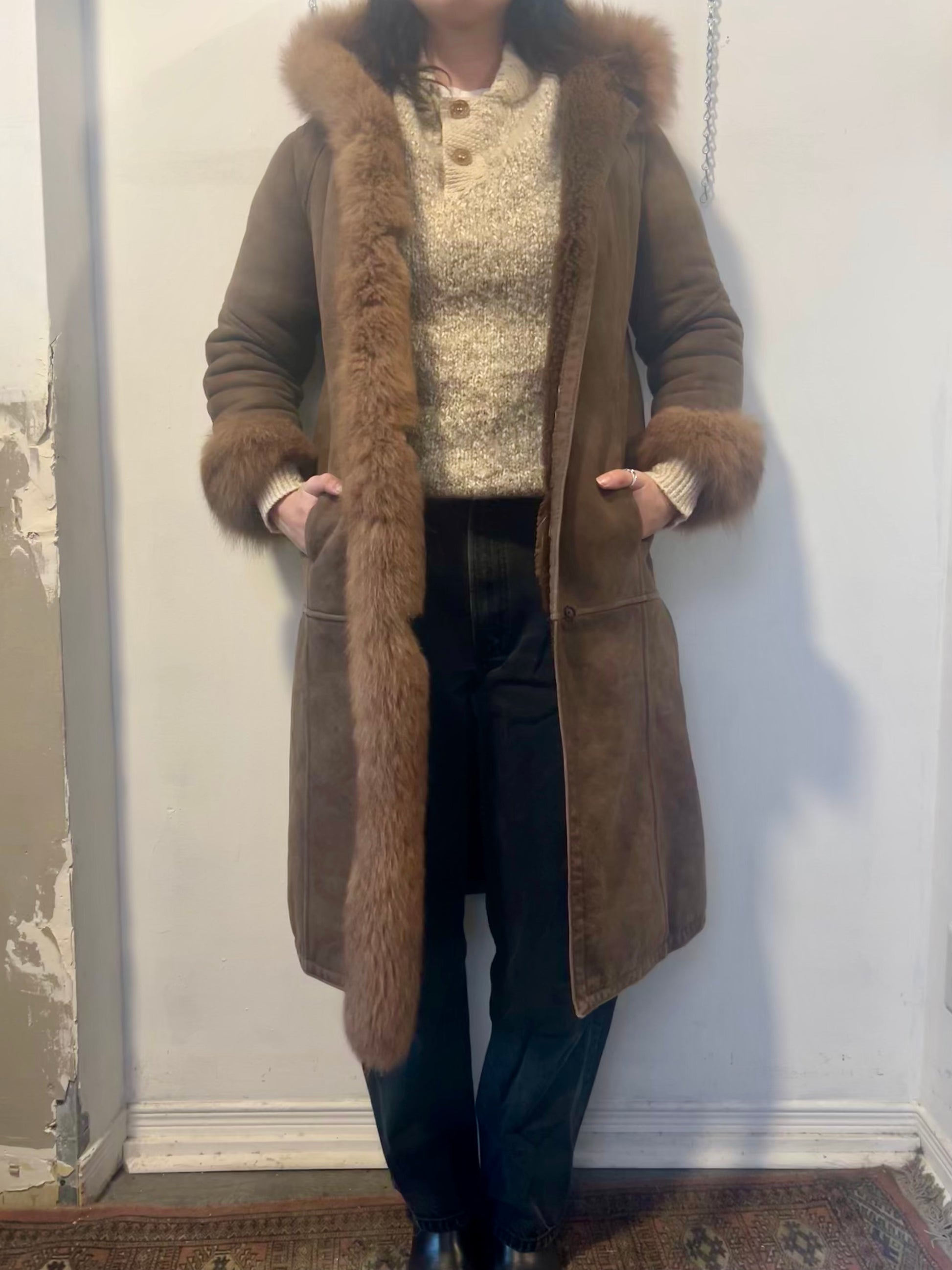 80’s Vintage Brown Sheepskin & Fur Trim Hooded Coat / Size S