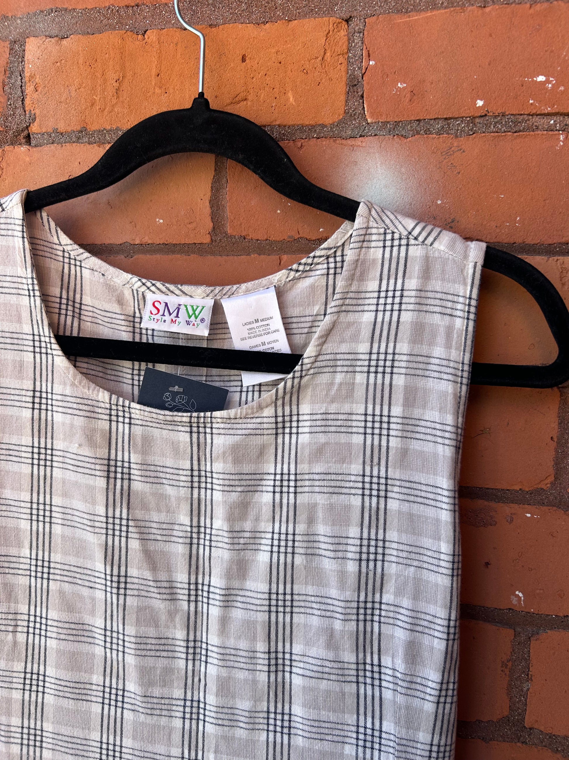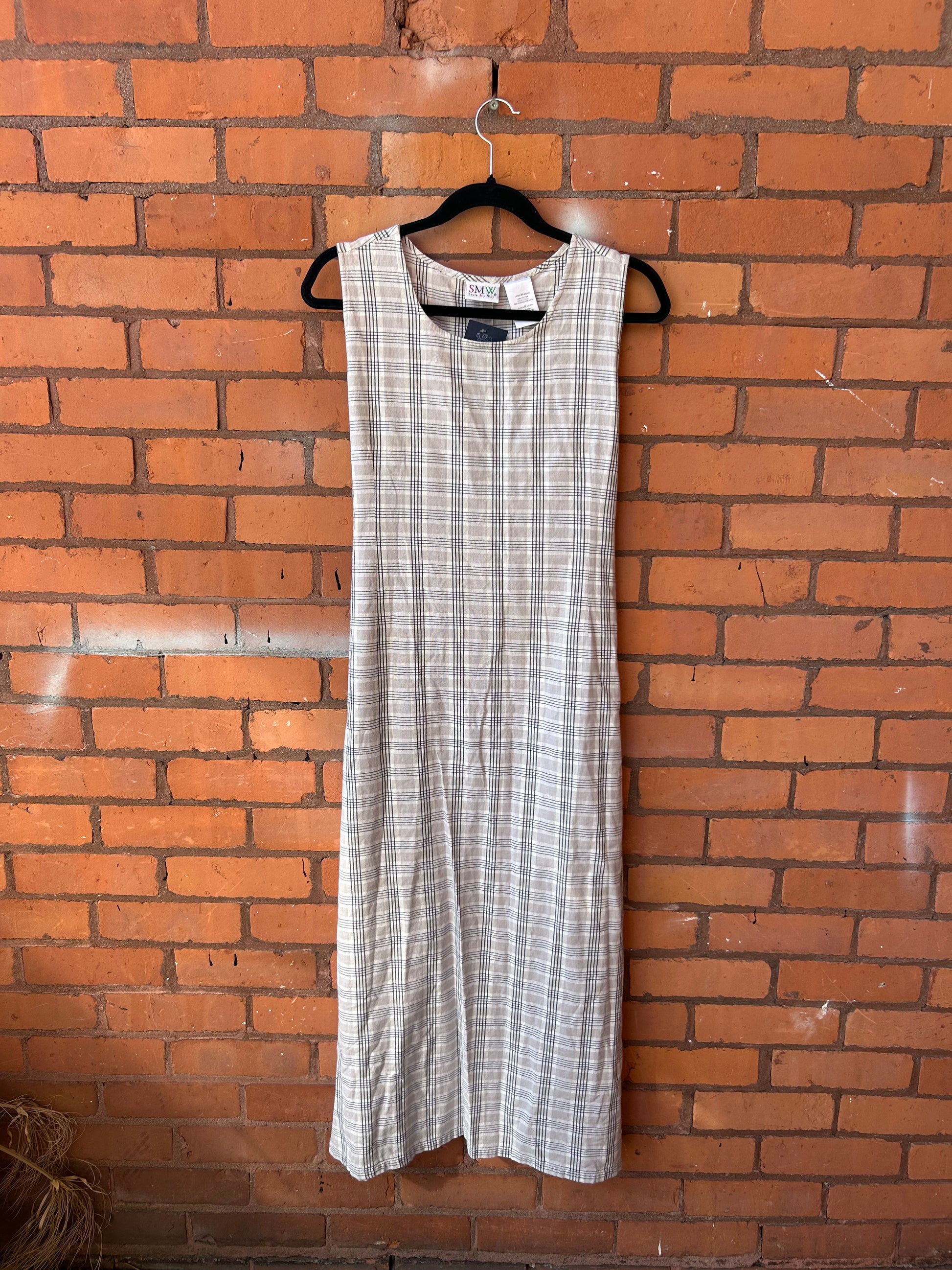 90’s Vintage Beige & White Plaid Cotton Button Side Maxi Dress/ Size M