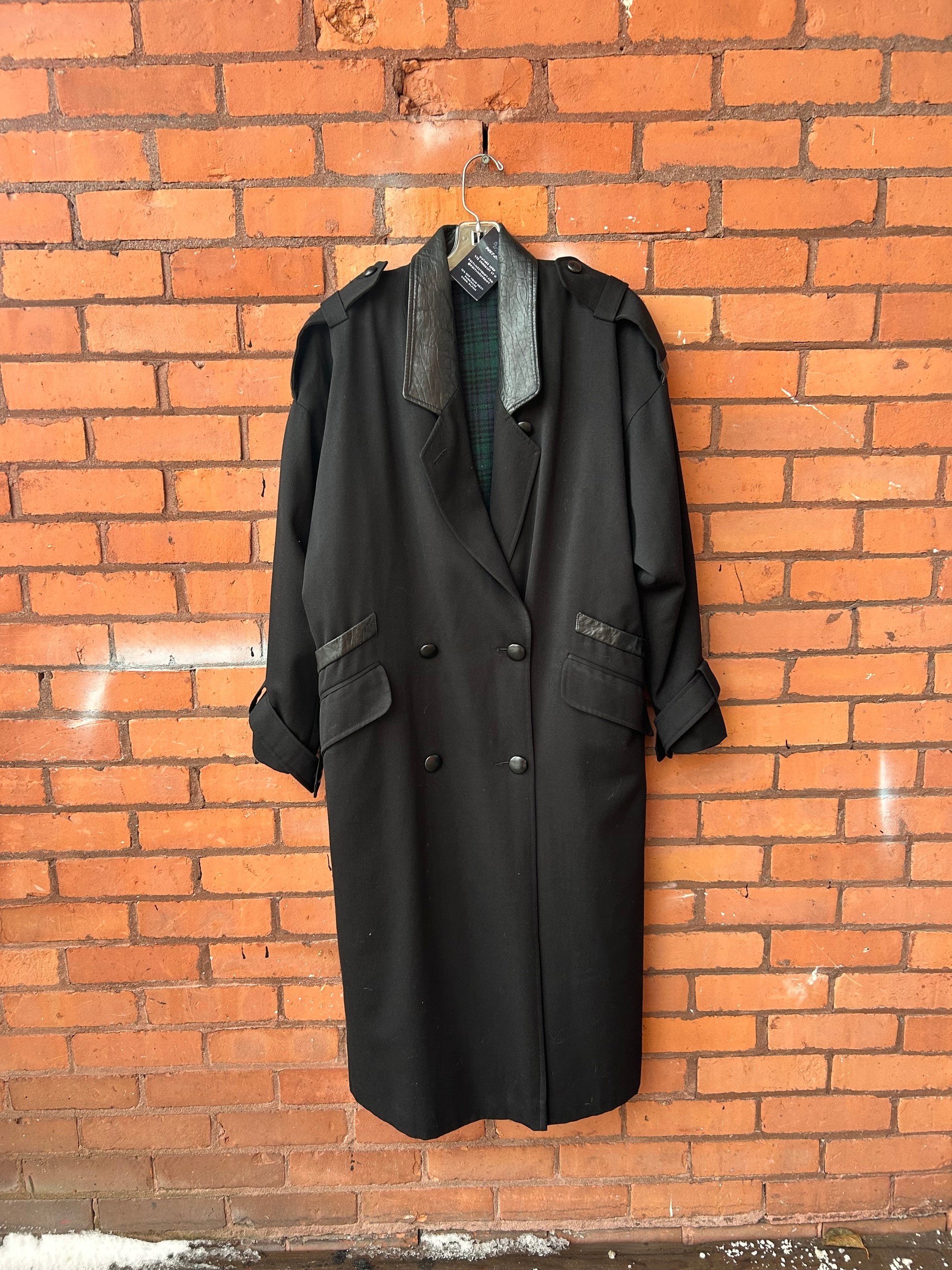 90’s Vintage Black Wool & Leather Over Coat / Size M