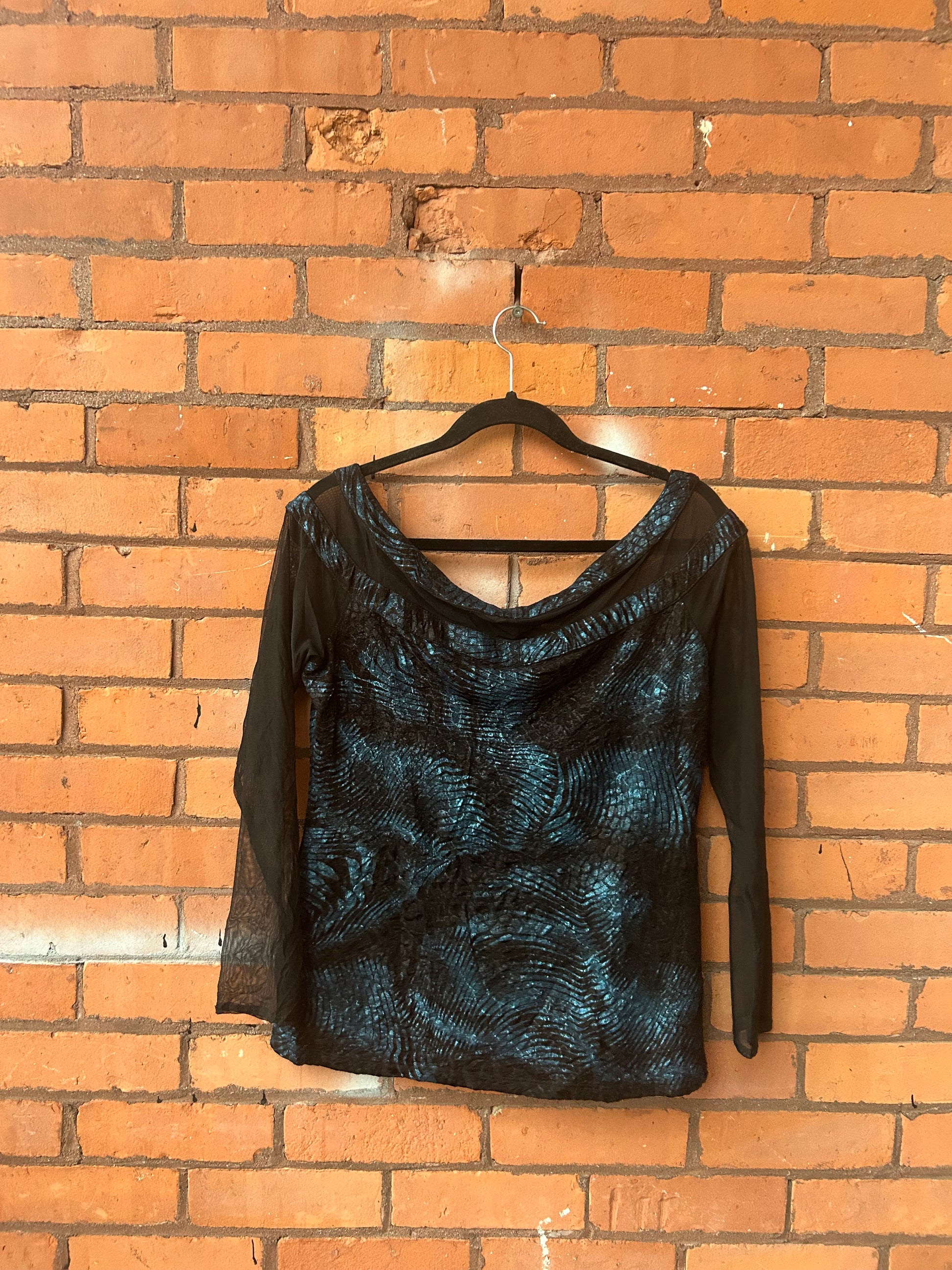 90’s Vintage Blue & Black Mesh Off the Shoulder Top / Size L
