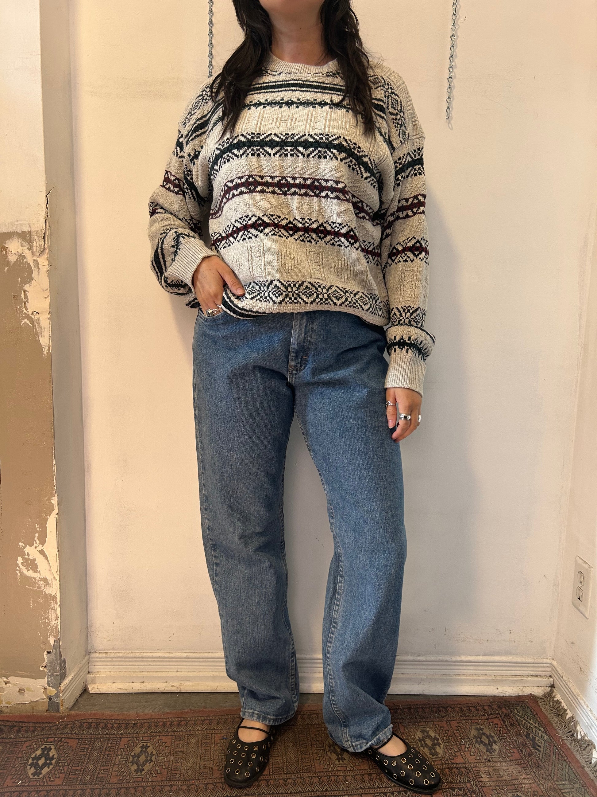 90’s Vintage Burgundy & Green Striped Cotton Knit Sweater / Size XL