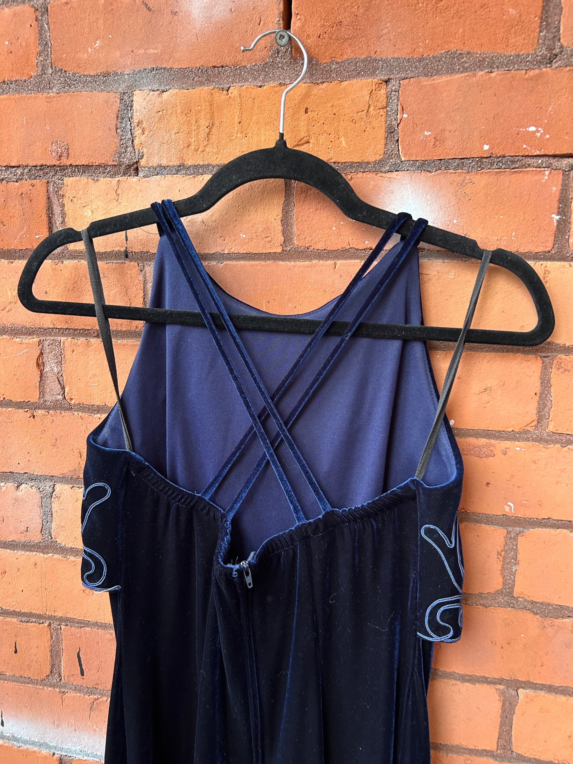 90’s Vintage Midnight Blue Velvet High Neck Maxi Dress / Size 6-8