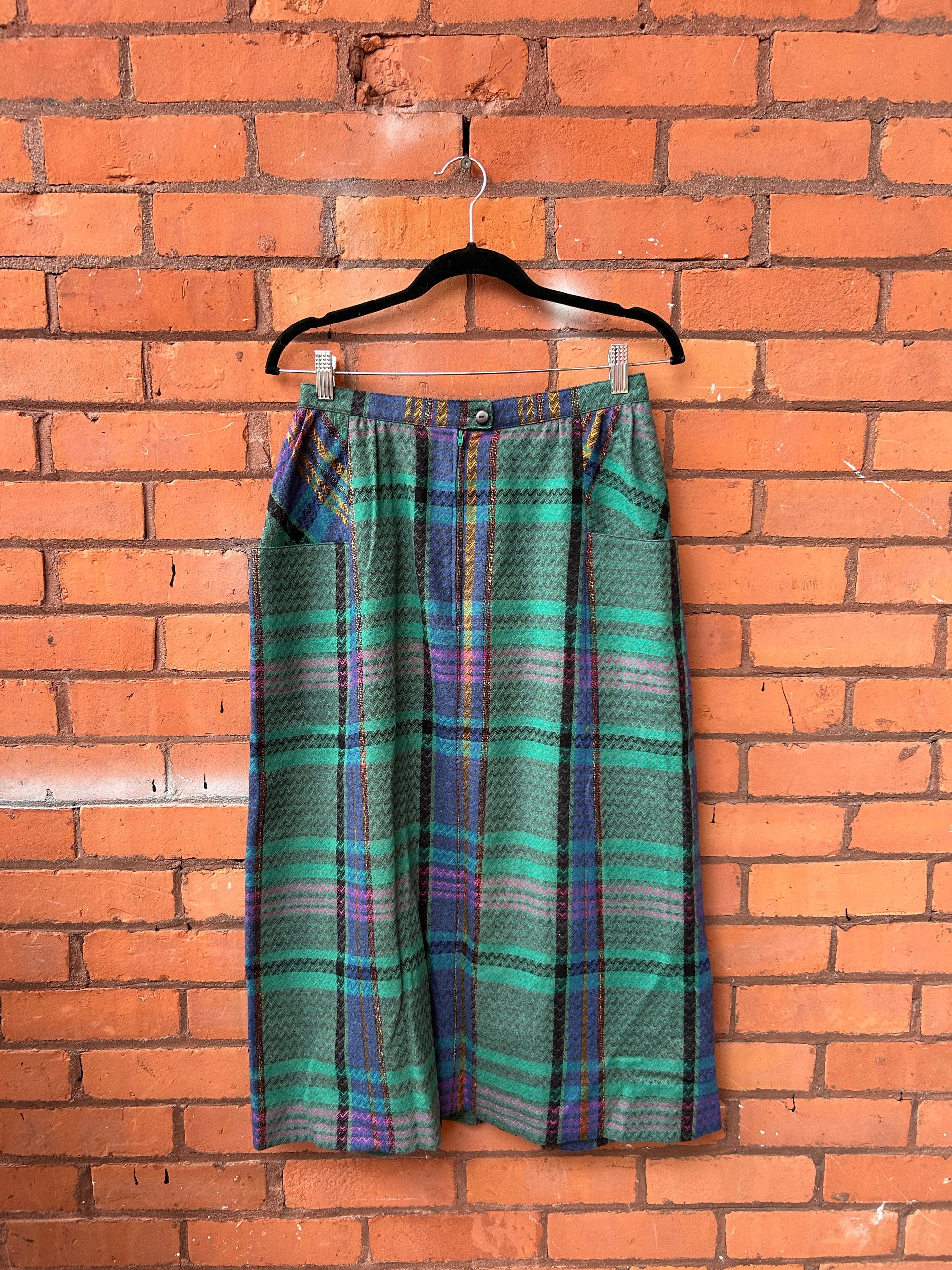 90’s Vintage Teal Plaid Midi Skirt / 29 Waist